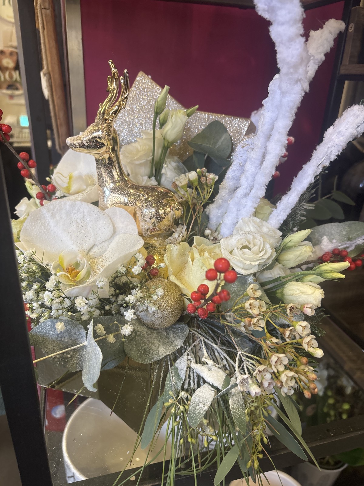 Composition florale pour centre de table de Noël, chez un artisan fleuriste à Marseille, 13006